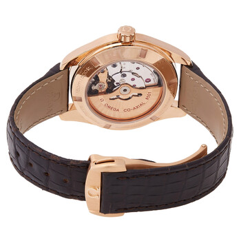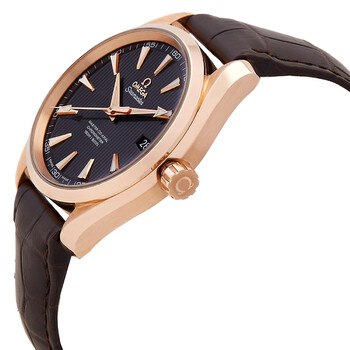 18k rose gold case with a brown alligator leather strap. Fixed bezel. Teak grey dial with rose gold-tone hands and index hour markers. Minute markers around the outer rim. Dial Type: Analog. Date display at the 3 o'clock position. Automatic movement. Calire 8501 engine. Scratch resistant sapphire crystal. Case diameter: 41.5 mm. Round case shape. Water resistant at 150 meters / 500 feet. Functions: date, hour, minute, second. Luxury watch style. Watch label: Swiss Made. Omega Seamaster Aqua Terra Teak Grey Dial 18K Rose Gold Automatic Men's Watch 231.53.42.21.06.002.