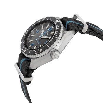 Grey titanium case with a black nylon strap. Uni-directional rotating black ceramic bezel. Black dial with black hands and index hour markers. Minute markers around the outer rim. Dial Type: Analog. Luminescent hands and markers. Omega Calibre 8912 Automatic movement, containing 39 Jewels, bitting at 25200 vph, and has a power reserve of approximately 60 hours. Scratch resistant sapphire crystal. Screw down crown. Solid case back. Round case shape, case size: 45 mm. Buckle clasp. Water resistant at 6000 meters / 20000 feet. Functions: hour, minute, second, co-axial escapement, chronometer. Additional Info: original box, manual (complete accessories). Seamaster Series. Dive watch style. Watch label: Swiss Made. Omega Seamaster Automatic Chronometer Black Dial Men's Watch 215.92.46.21.01.001.