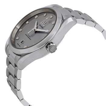 Silver-tone stainless steel case with a silver-tone stainless steel bracelet. Fixed smooth silver-tone stainless steel bezel. Velvet-grey dial with luminous silver-tone arrow-shaped hands and diamond hour markers. Dial Type: Analog. Luminescent hands. Date display at the 6 o'clock position. Omega Calibre 8800 Automatic movement, containing 35 Jewels, bitting at 25200 vph, and has a power reserve of approximately 55 hours. Scratch resistant sapphire crystal. Screw down crown. Transparent see through case back. Round case shape, case size: 38 mm, case thickness: 13.2 mm. Band width: 19 mm. Fold over with push button release clasp. Water resistant at 100 meters / 330 feet. Functions: date, hour, minute, second, chronometer. Seamaster Series. Luxury watch style. Watch label: Swiss Made. Omega Seamaster Automatic Chronometer Diamond 38 mm Watch 220.10.38.20.56.001.