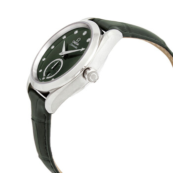 Stainless steel case with a black (alligator) leather strap. Fixed stainless steel bezel. Green dial with luminous silver-tone hands and diamond hour markers. Dial Type: Analog. Luminescent hands. Date display at the 6 o'clock position. Small seconds sub-dials. Omega calibre 8802 automatic movement, based upon Omega 8800, containing 35 Jewels, bitting at 25200 vph, and has a power reserve of approximately 55 hours. Scratch resistant sapphire crystal. Screw down crown. Transparent case back. Round case shape. Case size: 38 mm. Band width: 19 mm. Deployment clasp with a push button release. Water resistant at 150 meters / 500 feet. Functions: date, hour, minute, small second, co-axial escapement, chronometer, magnetic resistant. Additional Info: original box, manual (complete accessories). Seamaster Series. Luxury watch style. Watch label: Swiss Made. Omega Seamaster Automatic Chronometer Diamond Green Dial Ladies Watch 220.13.38.20.60.001.