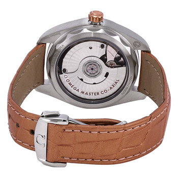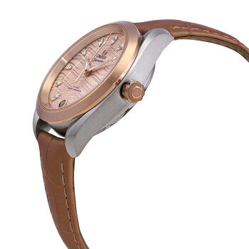 Stainless steel case with a brown leather strap. Fixed 18kt rose gold bezel. Grey dial with luminous rose gold-tone hands and diamond hour markers. Dial Type: Analog. Luminescent hands. Date display at the 6 o'clock position. Omega calibre 8800 automatic movement, containing 35 Jewels, bitting at 25200 vph, and has a power reserve of approximately 55 hours. Scratch resistant sapphire crystal. Screw down crown. Transparent case back. Round case shape. Case size: 34 mm. Band width: 16 mm. Fold over clasp. Water resistant at 150 meters / 500 feet. Functions: date, hour, minute, second, co-axial escapement, chronometer, magnetic resistant. Additional Info: original box, manual (complete accessories). Seamaster Series. Luxury watch style. Watch label: Swiss Made. Omega Seamaster Automatic Chronometer Diamond Grey Dial Ladies Watch 220.23.34.20.59.001.