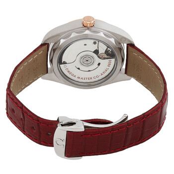 Silver-tone stainless steel case with a red alligator band. Fixed rose gold-tone 18kt rose gold bezel. Pink dial with rose gold-tone hands and rubyv hour markers. Dial Type: Analog. Date display at the 6 o'clock position. Omega Calibre 8800 Automatic movement, containing 35 Jewels, bitting at 25200 vph, and has a power reserve of approximately 55 hours. Scratch resistant sapphire crystal. Transparent see through case back. Round case shape, case size: 34 mm. Fold over clasp with a safety release. Water resistant at 150 meters / 500 feet. Functions: date, hour, minute, second, co-axial escapement, chronometer, magnetic resistant. Seamaster Series. Luxury watch style. Watch label: Swiss Made. Omega Seamaster Automatic Chronometer Pink Dial Ladies Watch 220.23.34.20.60.001.