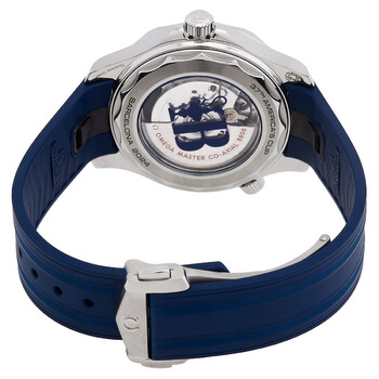 Silver-tone ceramic case with a blue rubber strap. Uni-directional rotating blue ceramic bezel. White dial with blue hands and index hour markers. Minute markers around the outer rim. Dial Type: Analog. Luminescent hands and markers. Omega Calibre 8806 Automatic movement, containing 35 Jewels, bitting at 25200 vph, and has a power reserve of approximately 55 hours. Scratch resistant sapphire crystal. Screw down crown. Transparent see through case back. Round case shape, case size: 42 mm. Fold over clasp with a safety release. Water resistant at 300 meters / 1000 feet. Functions: hour, minute, second, co-axial escapement, chronometer, magnetic resistant. Seamaster Series. Dive watch style. Watch label: Swiss Made. Omega Seamaster Automatic Chronometer White Dial Men's Watch 210.32.42.20.04.002.