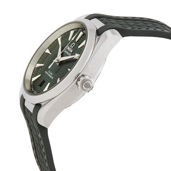 Silver-tone stainless steel case with a green rubber strap. Fixed silver-tone stainless steel bezel. Green dial with silver-tone hands and index hour markers. Minute scale around the inner rim. Dial Type: Analog. Luminescent hands and markers. Date display at the 6 o'clock position. Omega Calibre 8800 Automatic movement, containing 35 Jewels, bitting at 25200 vph, and has a power reserve of approximately 55 hours. Scratch resistant sapphire crystal. Screw down crown. Transparent see through case back. Round case shape, case size: 38 mm, case thickness: 12.2 mm. Fold over clasp. Water resistant at 150 meters / 500 feet. Functions: date, hour, minute, second. Seamaster Series. Sport watch style. Watch label: Swiss Made. Omega Seamaster Automatic Green Dial Unisex Watch 220.12.38.20.10.001.
