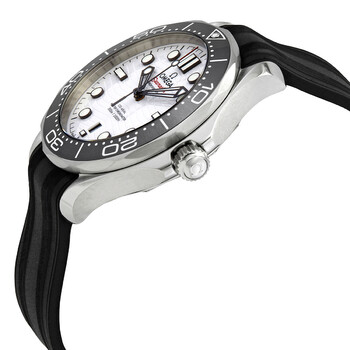 Silver-tone stainless steel case with a black rubber strap. Uni-directional rotating (count-up elapsed time) silver-tone stainless steel with a black ceramic ring bezel. White dial with luminous black skeleton hands and dot hour markers. Minute markers around the outer rim. Dial Type: Analog. Luminescent hands and markers. Date display at the 6 o'clock position. Omega Calibre 8800 Automatic movement, containing 35 Jewels, bitting at 25200 vph, and has a power reserve of approximately 55 hours. Scratch resistant sapphire crystal. Screw down crown. Transparent case back. Round case shape, case size: 42 mm. Band width: 20 mm. Tang clasp. Water resistant at 300 meters / 1000 feet. Functions: date, hour, minute, second, co-axial escapement, chronometer, magnetic resistant. Seamaster Series. Dive watch style. Watch label: Swiss Made. Omega Seamaster Automatic White Dial Men's Watch 210.32.42.20.04.001.