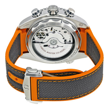 Grey titanium case with a grey rubber strap with orange stitching. Uni-directional rotating grey titanium bezel with a grey and orange ceramic top ring. Grey dial with luminous black arrow-shaped hands and index hour markers. An Arabic numeral appears at the 12 o'clock position. Minute markers around the outer rim. Dial Type: Analog. Luminescent hands and markers. Date display at the 6 o'clock position. Chronograph - two sub-dials displaying: 60 second and 12 hours. Omega calibre 9900 automatic movement, based upon Omega 9300, containing 54 Jewels, bitting at 28800 vph, and has a power reserve of approximately 60 hours. Scratch resistant sapphire crystal. Screw down crown. Transparent case back. Round case shape. Case size: 45.5 mm. Case thickness: 18.87 mm. Band width: 22 mm. Deployment clasp with a push button release. Water resistant at 600 meters / 2000 feet. Functions: chronograph, date, hour, minute, second, co-axial escapement, chronometer. Seamaster Series. Luxury watch style. Watch label: Swiss Made. Omega Seamaster Chronograph Automatic Men's Watch 215.92.46.51.99.001.