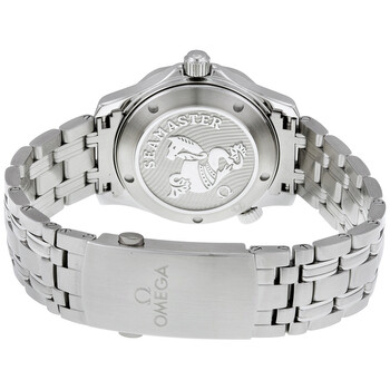 Silver-tone stainless steel case with a silver-tone stainless steel bracelet. Uni-directional rotating stainless steel bezel with a blue ceramic count-up elapsed time top ring. Blue dial with silver-tone skeleton hands and dot hour markers. Minute markers around the outer rim. Dial Type: Analog. Luminescent hands and markers. Date display at the 3 o'clock position. Omega Calibre 2500 Automatic movement, based upon ETA 2892-A2, containing 27 Jewels, bitting at 25200 vph, and has a power reserve of approximately 48 hours. Scratch resistant sapphire crystal. Screw down crown. Solid case back. Round case shape, case size: 36.25 mm, case thickness: 9 mm. Band width: 15 mm, band length: 7 inches. Fold over deployment clasp. Water resistant at 300 meters / 1000 feet. Functions: date, hour, minute, second, chronometer. Seamaster Series. Dive watch style. Watch label: Swiss Made. Omega Seamaster Chronometer Unisex Watch 212.30.36.20.03.001.