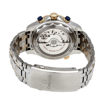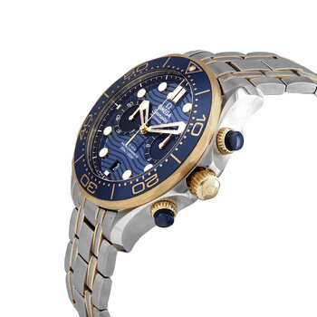 Silver-tone stainless steel case with a silver-tone stainless steel with 18kt yellow gold accents bracelet. Uni-directional rotating blue 18kt yellow gold with blue ceramic (count-up elapsed time) ring bezel. Blue dial with luminous yellow gold-tone skeleton sword-shaped hands and dot hour markers. Minute markers around the outer rim. Dial Type: Analog. Luminescent hands and markers. Date display at the 6 o'clock position. Chronograph - two sub-dials displaying: 60 second and 12 hour. Omega Calibre 9900 Automatic movement, based upon Omega 9300, containing 54 Jewels, bitting at 28800 vph, and has a power reserve of approximately 60 hours. Scratch resistant sapphire crystal. Screw down crown. Transparent case back. Round case shape, case size: 44 mm. Band width: 21 mm. Fold over clasp with a push button release. Water resistant at 300 meters / 1000 feet. Functions: chronograph, date, hour, minute, second,chronometer. Seamaster Diver 300m Co-axial Master Series. Dive watch style. Watch label: Swiss Made. Omega Seamaster Diver 300m Co-Axial Master Chronograph Automatic Chronometer Watch 210.20.44.51.03.001.