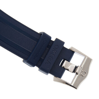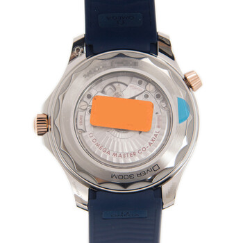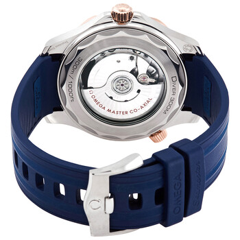 Stainless steel case with a blue rubber strap. Uni-directional rotating 18kt sedna gold bezel with an inlaid blue ceramic ring. Blue dial with luminous rose gold-tone hands and dot hour markers. Minute markers around the outer rim. Dial Type: Analog. Luminescent hands. Date display at the 6 o'clock position. Master Co-Axial caliber 8800 automatic movement with a 55-hour power reserve. Scratch resistant sapphire crystal. Screw down crown. Transparent case back. Round case shape. Case size: 42 mm. Band width: 20 mm. Tang clasp. Water resistant at 300 meters / 1000 feet. Functions: date, hour, minute, second. Luxury watch style. Watch label: Swiss Made. Omega Seamaster Diver Automatic Stainless Steel & 18kt Sedna Gold Blue Dial Men's 42 mm Watch 210.22.42.20.03.002.