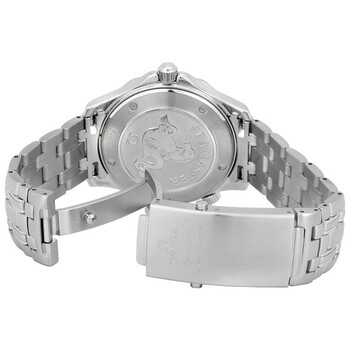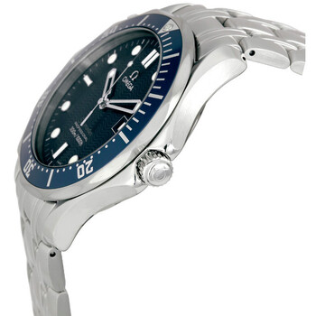 Stainless steel case with a stainless steel bracelet. Unidirectional rotating blue ion-plated bezel. Blue dial with luminous hands and dot hour markers, minute markers around the outer rim hour markers. Minute markers around the outer rim. Luminescent hands and dial markers. Date display at the 3 o'clock position. Quartz movement. Scratch resistant sapphire crystal. Screw down crown. Screw down case back. Case diameter: 41 mm. Case thickness: 13 mm. Push button deployment clasp. Water resistant at 300 meters / 1000 feet. Functions: hours/ minutes/ seconds/ date. Additional Info: easy time zone change/ battery end of life indicator/ helium escape valve. Omega Seamaster James Bond Men's Watch 2221.80.