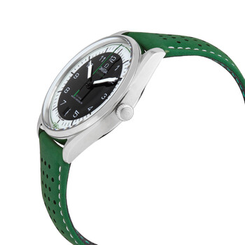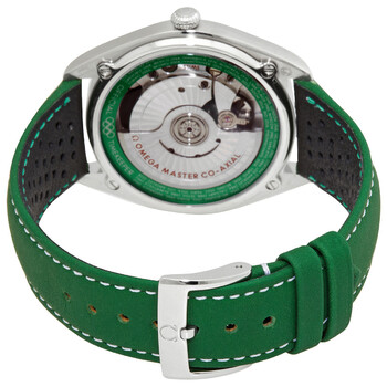 Stainless steel case with a green (micro-perforated) leather strap. Fixed stainless steel bezel. Silver (black center) dial with luminous silver-tone hands and Arabic numeral hour markers. Minute markers around the outer rim. Dial Type: Analog. Luminescent hands and markers. Date display at the 6 o'clock position. Omega calibre 8800 automatic movement, containing 35 Jewels, bitting at 25200 vph, and has a power reserve of approximately 55 hours. Scratch resistant sapphire crystal. Pull / push crown. Transparent case back. Round case shape. Case size: 39.5 mm. Band width: 20 mm. Deployment clasp with a push button release. Water resistant at 60 meters / 200 feet. Functions: date, hour, minute, second. Additional Info: limited edition (2,032). Seamaster Official Timekeeper Series. Luxury watch style. Watch label: Swiss Made. Omega Seamaster Official Timekeeper Automatic Men's Watch 522.32.40.20.01.005.