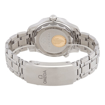 Silver-tone stainless steel case and bracelet. Gold-tone 18kt yellow gold bezel. White dial with 18k moonshine™ gold hands and index hour markers. Minute markers around the outer rim. Dial Type: Analog. Luminescent hands and markers. Date display at the 6 o'clock position. Omega Calibre 8800 Automatic movement, containing 35 Jewels, bitting at 25200 vph, and has a power reserve of approximately 55 hours. Scratch resistant sapphire crystal. Screw down crown. Solid case back. Round case shape, case size: 42 mm, case thickness: 13.7 mm. Fold over clasp. Water resistant at 300 meters / 1000 feet. Functions: date, hour, minute, second, co-axial escapement, chronometer, magnetic resistant. Seamaster Series. Dive watch style. Watch label: Swiss Made. Omega Seamaster Automatic Chronometer White Dial Men's Watch 522.21.42.20.04.001.