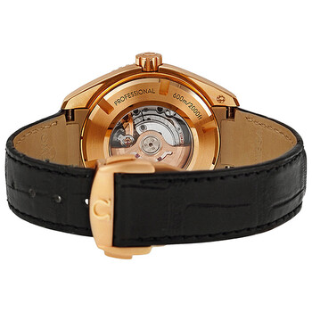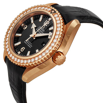 18kt rose gold case with a black (alligator) leather strap. Uni-directional rotating 18kt rose gold set with diamonds bezel. Black dial with luminous rose gold-tone hands and index hour markers. Arabic numerals mark the 6, 9 and 12 o'clock positions. Minute markers around the outer rim. Dial Type: Analog. Date display at the 3 o'clock position. Omega calibre 8521 automatic movement, based upon Omega 8520, containing 28 Jewels, bitting at 25200 vph, and has a power reserve of approximately 50 hours. Scratch resistant sapphire crystal. Screw down crown. Transparent case back. Round case shape. Case size: 37.5 mm. Band width: 18 mm. Push button fold over clasp. Water resistant at 600 meters / 2000 feet. Functions: date, hour, minute, second, chronometer. Luxury watch style. Watch label: Swiss Made. Item Variations: 232 58 38 20 01 001, 232-58-38-20-01-001, 232/58/38/20/01/001, 23258382001001. Omega Seamaster Planet Ocean 18kt Rose Gold Diamond 37.5 mm Watch 232.58.38.20.01.001.