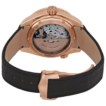 18kt rose gold case with a black leather strap. Bi-directional rotating 18kt rose gold bezel with a black ceramic top ring. Black dial with luminous rose gold-tone hands and index hour markers. Arabic numerals mark the 6, 9 and 12 o'clock positions. Minute markers around the outer rim. Dial Type: Analog. Luminescent hands and markers. Date display at the 3 o'clock position. Omega calibre 8615 automatic movement with a 60-hour power reserve. Scratch resistant sapphire crystal. Screw down crown. Transparent case back. Case size: 43.5 mm. Case thickness: 17.25 mm. Round case shape. Band width: 21 mm. Fold over clasp. Water resistant at 600 meters / 2000 feet. Functions: GMT, second time zone, hour, minute, second, date. Luxury watch style. Watch label: Swiss Made. Omega Seamaster Planet Ocean 18kt Rose Gold GMT Automatic Men's Watch 232.63.44.22.01.001.