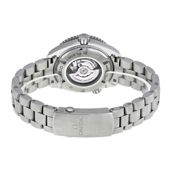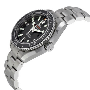 Silver-tone stainless steel case with a silver-tone stainless steel bracelet. Uni-directional rotating black ceramic bezel. Black dial with luminous silver-tone hands and index hour markers. Arabic numerals mark the 6, 9 and 12 o'clock positions. minute markers around the outer rim. Dial Type: Analog. Luminescent hands and markers. Date display at the 3 o'clock position. Omega Calibre 8520 automatic movement with a 50-hour power reserve. Scratch resistant sapphire crystal. Screw down crown. Transparent case back. Round case shape, case size: 37.5 mm, case thickness: 10 mm. Band width: 18 mm, band length: 8.5 inches. Fold over clasp. Water resistant at 600 meters / 2000 feet. Functions: date, hour, minute, second, chronometer. Additional Info: features a helium escapement valve located on the edge of the case at the 10 o'clock position. Luxury watch style. Watch label: Swiss Made. Omega Seamaster Planet Ocean 600M Automatic Chronometer Black Dial Mid-Size Watch 232.30.38.20.01.001.