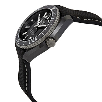 Black ceramic case with a black rubber strap. Uni-directional rotating coin edge stainless steel bezel with an inlaid black ceramic ring. Black dial with luminous silver-tone arrow-shaped hands and index hour markers. Arabic numerals mark the 6, 9 and 12 o'clock positions. Minute markers around the outer rim. Dial Type: Analog. Luminescent hands and markers. Date display at the 3 o'clock position. Omega calibre 8800 automatic movement, containing 35 Jewels, bitting at 25200 vph, and has a power reserve of approximately 55 hours. Scratch resistant sapphire crystal. Screw down crown. Transparent case back. Round case shape. Case size: 39.5 mm. Case thickness: 14.16 mm. Band width: 19 mm. Fold over clasp with a push button release. Water resistant at 600 meters / 2000 feet. Functions: date, hour, minute, second. Seamaster Planet Ocean Series. Dive watch style. Watch label: Swiss Made. Omega Seamaster Planet Ocean Automatic Black Dial Men's Watch 215.92.40.20.01.001.