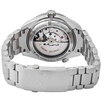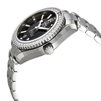 Stainless steel case with a stainless steel bracelet. Uni-directional rotating stainless steel set with diamonds bezel. Black dial with luminous silver-tone hands and index hour markers. Arabic numerals mark the 6, 9 and 12 o'clock positions. Minute markers around the inner rim. Dial Type: Analog. Luminescent hands and markers. Date display at the 6 o'clock position. Omega calibre 8500 automatic movement, containing 39 Jewels, composed of 202 parts, bitting at 25200 vph, and has a power reserve of approximately 60 hours. Scratch resistant sapphire crystal. Screw down crown. Transparent case back. Round case shape. Case size: 42 mm. Case thickness: 16.3 mm. Band width: 20 mm. Push button fold over clasp. Water resistant at 600 meters / 2000 feet. Functions: date, hour, minute, second, co-axial escapement, chronometer. Dive watch style. Watch label: Swiss Made. Omega Seamaster Planet Ocean Automatic Men's Watch 232.15.42.21.01.001.