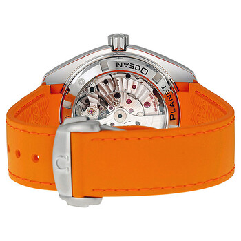 Stainless steel case with a orange rubber strap. Uni-directional rotating stainless steel bezel with an inlaid orange ion-plated ring. Black dial with luminous silver-tone hands and index hour markers. Arabic numerals mark the 6, 9 and 12 o'clock positions. Minute markers around the outer rim. Dial Type: Analog. Luminescent hands and markers. Date display at the 3 o'clock position. Omega calibre 8500 automatic movement, containing 39 Jewels, composed of 202 parts, bitting at 25200 vph, and has a power reserve of approximately 60 hours. Scratch resistant sapphire crystal. Screw down crown. Skeleton case back. Round case shape. Case size: 42 mm. Case thickness: 16.3 mm. Band width: 20 mm. Deployment clasp with a push button release. Water resistant at 600 meters / 2000 feet. Functions: date, hour, minute, second, chronometer. Seamaster Planet Ocean Series. Luxury watch style. Watch label: Swiss Made. Omega Seamaster Planet Ocean Automatic Men's Watch 23232422101001.