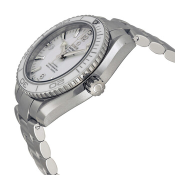 Stainless steel case with a stainless steel bracelet. Uni-directional rotating stainless steel bezel with a white ceramic top ring. White dial with luminous silver-tone hands and stick hour markers. Arabic numerals mark the 6, 9 and 12 o'clock positions. Minute markers around the outer rim. Dial Type: Analog. Luminescent hands and markers. Date display at the 3 o'clock position. Automatic movement with a 60-hour power reserve. Scratch resistant sapphire crystal. Screw down crown. Skeleton case back. Case diameter: 42 mm. Case thickness: 16.3 mm. Round case shape. Bracelet width: 20 mm. Deployment clasp with a push button release. Water resistant at 600 m / 2000 ft. Functions: date, hour, minute, second. Luxury watch style. Watch label: Swiss Made. Omega Seamaster Planet Ocean Automatic White Dial Stainless Steel Men's Watch 232.30.42.21.04.001.