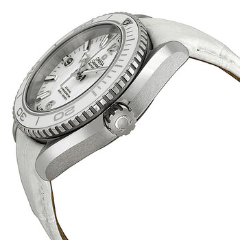 Stainless steel case with a white leather strap. Uni-directional rotating bezel. White dial with silver-tone hands and stick hour markers. Minute markers around the outer rim. Dial Type: Analog. Luminescent hands and markers. Date display appears at the 3 o'clock position. Automatic movement. Omega 8520 engine. Scratch resistant sapphire crystal. Screw down crown. Skeleton case back. Case diameter: 37.5 mm. Round case shape. Deployment with push button clasp. Water resistant at 600 meters / 2000 feet. Functions: date, hour, minute, second. Luxury watch style. Watch label: Swiss Made. Omega Seamaster Planet Ocean Automatic White Dial Stainless Steel Men's Watch 232.33.38.20.04.001.