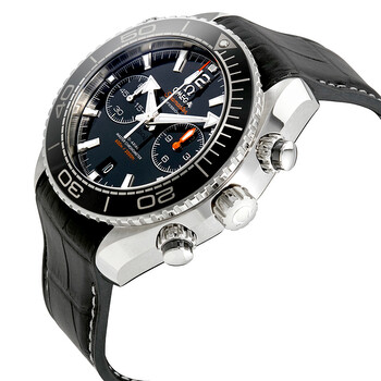 Stainless steel case with a black rubber strap with a (stiched) black (alligator) leather top. Uni-directional rotating stainless steel bezel with a black ceramic (count-up elapsed time) top ring. Black dial with luminous silver-tone arrow-shaped hands and index hour markers. An Arabic numeral appears at the 12 o'clock position. Minute markers around the outer rim. Dial Type: Analog. Luminescent hands and markers. Date display at the 6 o'clock position. Chronograph - two sub-dials displaying: 60 second and 12 hour. Omega calibre 9900 automatic movement, based upon Omega 9300, containing 54 Jewels, bitting at 28800 vph, and has a power reserve of approximately 60 hours. Scratch resistant sapphire crystal. Screw down crown. Transparent case back. Round case shape. Case size: 45.5 mm. Case thickness: 18.87 mm. Band width: 22 mm. Deployment with push button release clasp. Water resistant at 600 meters / 2000 feet. Functions: chronograph, date, hour, minute, second, co-axial escapement, chronometer. Seamaster Planet Ocean Series. Luxury watch style. Watch label: Swiss Made. Omega Seamaster Planet Ocean Chronograph Automatic Men's Watch 215.33.46.51.01.001.