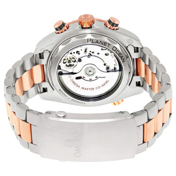 Stainless steel case with a stainless steel bracelet with sedna gold center links. Uni-directional rotating coin edge sedna gold bezel with a blue ceramic (count-up elapsed time) top ring. Blue dial with luminous rose gold-tone arrow-shaped hands and index hour markers. An Arabic numeral appears at the 12 o'clock position. Minute markers around the outer rim. Dial Type: Analog. Luminescent hands and markers. Date display at the 6 o'clock position. Chronograph - two sub-dials displaying: 60 second and 12 hour. Omega calibre 9900 automatic movement, based upon Omega 9300, containing 54 Jewels, bitting at 28800 vph, and has a power reserve of approximately 60 hours. Scratch resistant sapphire crystal. Screw down crown. Transparent case back. Round case shape. Case size: 45.5 mm. Case thickness: 19 mm. Band width: 22 mm. Deployment clasp. Water resistant at 600 meters / 2000 feet. Functions: chronograph, date, hour, minute, second, co-axial escapement, chronometer. Seamaster Planet Ocean Series. Dive watch style. Watch label: Swiss Made. Omega Seamaster Planet Ocean Chronograph Sedna Gold Automatic Men's Watch 215.20.46.51.03.001.
