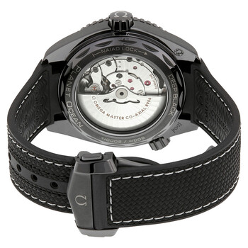 Black ceramic case with a black rubber strap. Uni-directional rotating black ceramic bezel. Black dial with 18k white gold arrow-shaped hands and index hour markers. Arabic numerals mark the 6, 9 and 12 o'clock positions. Minute markers. 24 hour markers around the outer rim. Dial Type: Analog. Luminescent hands and markers. Date display at the 3 o'clock position. Omega calibre 8906 automatic movement, based upon Omega 8900, containing 39 Jewels, bitting at 25200 vph, and has a power reserve of approximately 60 hours. Scratch resistant sapphire crystal. Screw down crown. Transparent case back. Round case shape. Case size: 45.5 mm. Case thickness: 17.6 mm. Band width: 22 mm. Deployment clasp with a push button release. Water resistant at 600 meters / 2000 feet. Functions: date, GMT, second time zone, hour, minute, second, co-axial escapement, chronometer. Dive watch style. Watch label: Swiss Made. Omega Seamaster Planet Ocean Automatic Men's Watch 215.92.46.22.01.001.