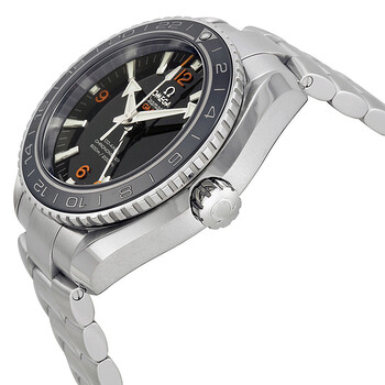 Stainless steel case with a stainless steel bracelet. Bi-directional rotating stainless steel bezel with black ceramic top ring showing 24 hour markers. Black dial with luminous silver-tone hands and index hour markers. Arabic numerals mark the 6, 9 and 12 o'clock positions. Minute markers around the outer rim. Dial Type: Analog. Luminescent hands and markers. Date display at the 3 o'clock position. Omega calibre 8605 automatic movement with a 60-hour power reserve. Scratch resistant, anti-reflective sapphire crystal. Screw down crown. Transparent case back. Case size: 43.5 mm. Case thickness: 17 mm. Round case shape. Band width: 20 mm. Fold over clasp with a double push button release. Water resistant at 600 meters / 2000 feet. Functions: GMT, second time zone, date, hour, minute, second, chronometer. Additional Info: in general, suitable for mixed-gas diving. Luxury watch style. Watch label: Swiss Made. Item Variations: 232 30 44 22 01 002, 232-30-44-22-01-002, 232/30/44/22/01/002, 23230442201002. Omega Seamaster Planet Ocean GMT Men's Watch 23230442201002.