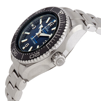 Silver-tone stainless steel case and bracelet. Uni-directional rotating black ceramic bezel. Blue dial with 18kt white gold hands and index-Arabic numeral hour markers. Arabic numeral markers at the 3, 6, 9 and 12 o'clock positions. Minute markers around the outer rim. Dial Type: Analog. Luminescent hands and markers. Omega Calibre 8912 Automatic movement, containing 39 Jewels, bitting at 25200 vph, and has a power reserve of approximately 60 hours. Scratch resistant sapphire crystal. Screw down crown. Transparent case back. Round case shape, case size: 45.5 mm. Band width: 22 mm. Water resistant at 600 meters / 2000 feet. Functions: hour, minute, second, co-axial escapement, chronometer. Seamaster Planet Ocean Series. Dive watch style. Watch label: Swiss Made. Omega Seamaster Planet Ocean Automatic Chronometer Blue Dial Men's Watch 215.30.46.21.03.001.