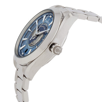 Silver-tone stainless steel case and bracelet. Fixed silver-tone stainless steel bezel. Blue dial with silver-tone hands and index hour markers. Dial Type: Analog. Luminescent hands and markers. Date display at the 6 o'clock position. Omega Calibre 8938 Automatic movement, containing 39 Jewels, bitting at 25200 vph, and has a power reserve of approximately 60 hours. Scratch resistant sapphire crystal. Screw down crown. Solid case back. Round case shape, case size: 43 mm. Fold over clasp with a safety release. Water resistant at 150 meters / 500 feet. Functions: world time, GMT, second time zone, hour, minute, second, co-axial escapement, chronometer, shock resistant. Additional Info: original box, manual (complete accessories). Seamaster Series. Luxury watch style. Watch label: Swiss Made. Omega Seamaster World Time GMT Automatic Chronometer Blue Dial Men's Watch 220.10.43.22.03.002.