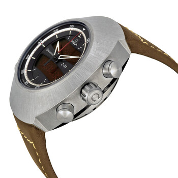 Titanium case with a brown leather strap. Fixed titanium bezel. Black Analog digital dial with skeleton hands and index hour markers. Minute markers around the outer rim. Dial Type: Analog-digital. Luminescent hands and markers. Perpetual calendar. Digital. Omega Calibre 5666 quartz movement with about 24 months of power reserve. Scratch resistant sapphire crystal. Pull / push crown. Solid case back. Case size: 43 mm x 53 mm. Case thickness: 20.2 mm. Oval case shape. Band width: 22.9 mm. Band length: 9 inches. Tang clasp. Water resistant at 30 meters / 100 feet. Functions: perpetual calendar, chronograph, GMT, second time zone, alarm, year, month, date, day, hour, minute, second, power reserve indicator, chronometer. Sport watch style. Watch label: Swiss Made. Item Variations: 325 92 43 79 01 002, 325-92-43-79-01-002, 325/92/43/79/01/002, 32592437901002. Omega Speedmaster Spacemaster Z-33 Black Analog-Digital Dial Brown Leather Chronograph Men's Watch 32592437901002.