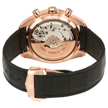 18kt sedna gold case with a black leather strap. Fixed 18kt sedna gold bezel with a black enamel ring showing tachymeter markings. Black dial with luminous sedna gold hands and index hour markers. Minute markers around the outer rim. Dial Type: Analog. Luminescent hands and markers. Date display at the 9 o'clock position. Chronograph - three sub-dials displaying: date / 60 second, moonphase, and 12 hour / 60 minute. Omega calibre 9905 automatic movement with a 60-hour power reserve. Scratch resistant sapphire crystal. Pull / Push crown. Transparent case back. Round case shape. Case size: 44.25 mm. Case thickness: 17.05 mm. Band width: 21 mm. Fold over clasp. Water resistant at 100 meters / 330 feet. Functions: moon phase, chronograph, column wheel, date, hour, minute, second, co-axial escapement, chronometer, shock resistant. Luxury watch style. Watch label: Swiss Made. Omega Speedmaster 18kt Sedna Gold Moon Phase Chronograph Automatic Men's Watch 304.63.44.52.01.001.