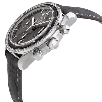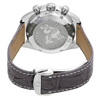 Stainless steel case with a grey leather strap. Fixed stainless steel bezel with an inlaid black aluminium ring set with diamond and showing tachymeter markings. Grey dial with luminous silver-tone hands and index hour markers. Minute markers around the outer rim. Dial Type: Analog. Luminescent hands and markers. Date display at the 6 o'clock position. Chronograph - three sub-dials displaying: 60 second, 30 minute and 12 hour. Omega calibre 3330 automatic movement, based upon ETA Valjoux 7753, containing 31 Jewels, bitting at 28800 vph, and has a power reserve of approximately 52 hours. Scratch resistant sapphire crystal. Pull / push crown. Transparent case back. Round case shape. Case size: 38 mm. Band width: 18 mm. Deployment clasp. Water resistant at 100 meters / 330 feet. Functions: chronograph, date, hour, minute, second. Speedmaster Series. Dress watch style. Watch label: Swiss Made. Omega Speedmaster Automatic Chronograph Grey Dial Unisex Watch 324.38.38.50.06.001.