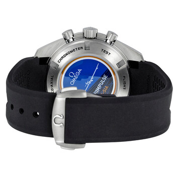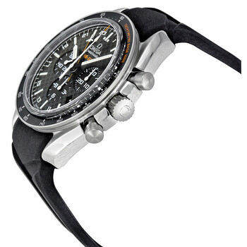 Titanium case with a black rubber strap. Fixed titanium bezel with black top ring showing tachymeter markings. Black carbon fiber dial with silver-tone hands and index hour markers. 24 hour markers. Minute markers around the outer rim. Dial Type: Analog. Luminescent hands and markers. Date display between 4 and 5 o'clock positions. Chronograph - three sub-dials displaying: 60 second, 30 minute and 12 hour. Automatic movement with a 52-hour power reserve. Scratch resistant sapphire crystal. Pull/push crown. Solid case back. Case diameter: 44.25 mm. Case thickness: 14 mm. Round case shape. Band width: 20 mm. Push button deployment clasp. Water resistant at 100 meters / 330 feet. Functions: GMT, second time zone, tachymeter, chronograph, hour, minute, second. Sport watch style. Watch label: Swiss Made. Omega Speedmaster Black Carbon Fibre Chonograph GMT Rubber Men's Watch 321.92.44.52.01.001.