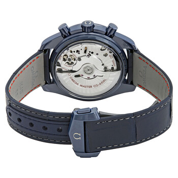 Blue ceramic case with a blue (alligator) leather strap. Fixed blue ceramic bezel showing tachymeter markings. Blue dial with 18kt white gold hands and index hour markers. Tachymeter. Dial Type: Analog. Luminescent hands and markers. Date display at the 9 o'clock position. Two sub-dials displaying: 12 hours and date. Moonphase display. Omega calibre 9904 automatic movement with a 60-hour power reserve. Scratch resistant sapphire crystal. Push / pull crown. Transparent case back. Round case shape. Case size: 44.25 mm. Band width: 21 mm. Deployment clasp. Water resistant at 100 meters / 330 feet. Functions: chronograph, tachymeter, date, hour, minute, second, moonphase, chronometer. Luxury watch style. Watch label: Swiss Made. Omega Speedmaster Blue Ceramic Dial Automatic Men's Moonphase Watch 304.93.44.52.03.001.