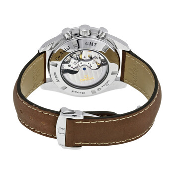Stainless steel case with a brown leather strap. Fixed stainless steel showing tachymeter scale. Black dial with silver-tone hands and stick hour markers. Minute markers around the outer rim. 24 hour scale. Dial Type: Analog. Luminescent hands and markers. Date display appears at the 6 o'clock position. Chronograph - three sub-dials displaying: 60 second, 30 minute and 12 hour. Automatic movement. Scratch resistant sapphire crystal. Screw down crown. Skeleton case back. Case diameter: 44.25 mm. Case thickness: 15.4 mm. Round case shape. Band width: 24.3 mm. Band length: 9.5 inches. Deployment clasp with push button release. Water resistant at 100 meters / 330 feet. Functions: chronograph, date, GMT, second time zone, hour, minute, second. Luxury watch style. Watch label: Swiss Made. Omega Speedmaster Broad Arrow GMT Chronograph Automatic Men's Watch 38815037.