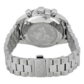Stainless steel case with a stainless steel bracelet. Fixed stainless steel bezel with a blue aluminium ring showing tachymeter markings. Blue dial with luminous silver-tone hands and index hour markers. Minute markers around the outer rim. Dial Type: Analog. Luminescent hands and markers. Date display at the 6 o'clock position. Chronograph - three sub-dials displaying: 60 second, 30 minute and 12 hour. Omega calibre 3330 automatic movement, based upon ETA Valjoux 7753, containing 31 Jewels, bitting at 28800 vph, and has a power reserve of approximately 52 hours. Scratch resistant sapphire crystal. Solid case back. Round case shape. Case size: 38 mm. Band width: 18 mm. Deployment with push button release clasp. Water resistant at 100 meters / 330 feet. Functions: chronograph, tachymeter, date, hour, minute, second. Speedmaster Series. Dress watch style. Watch label: Swiss Made. Omega Speedmaster Chronograph Automatic 38 mm Watch 324.30.38.50.03.001.