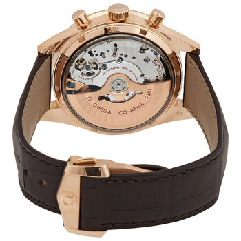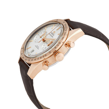 18kt rose gold case with a brown leather strap. Tachymeter scale bezel. Silver dial with silver-tone hands and index hour markers. Minute markers around the outer rim. Dial Type: Analog. Luminescent hands and markers. Date display at the 6 o'clock position. Chronograph - two sub-dials displaying: 60 second and 12 hour. Omega Calibre 9301 automatic movement with a 60-hour power reserve. Scratch resistant sapphire crystal. Case size: 41.5 mm. Round case shape. Band width: 20 mm. Water resistant at 100 meters / 330 feet. Functions: chronograph, column wheel, date, hour, minute, second, co-axial escapement, chronometer. Luxury watch style. Watch label: Swiss Made. Omega Speedmaster Chronograph Automatic Watch 331.53.42.51.02.002.