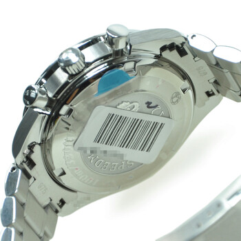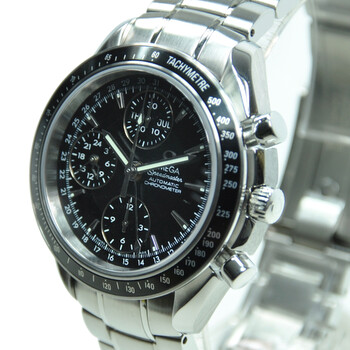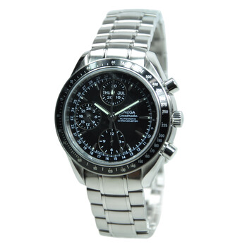 Silver-tone stainless steel case and bracelet. Fixed tachymeter scale black stainless steel bezel. Black dial with silver-tone hands and index hour markers. Minute markers around the outer rim. Dial Type: Analog. Luminescent hands and markers. Chronograph - three sub-dials displaying: 30 second, 12 hour and 24 hour. Omega Calibre 3606 Automatic movement, based upon ETA 7751, containing 25 Jewels, bitting at 28800 vph, and has a power reserve of approximately 44 hours. Scratch resistant sapphire crystal. Solid case back. Round case shape, case size: 40 mm. Fold over clasp with a safety release. Water resistant at 100 meters / 330 feet. Functions: chronograph, month, date, day, GMT, second time zone, hour, minute, small second, day/night indicator. Additional Info: original box, manual (complete accessories). Speedmaster Series. Luxury watch style. Watch label: Swiss Made. Omega Speedmaster Chronograph GMT Automatic Day-Night Black Dial Men's Watch 3220.50.00.