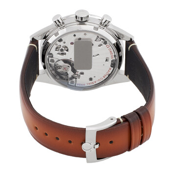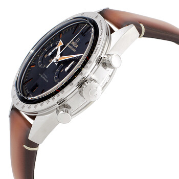 Silver-tone stainless steel case with a brown leather strap. Silver-tone stainless steel bezel. Black dial with silver-tone hands and index hour markers. Minute markers around the outer rim. Dial Type: Analog. Date display at the 6 o'clock position. Chronograph - two sub-dials displaying: 60 second and 12 hour/60 min. Omega Calibre 9906 Hand Wind movement, containing 44 Jewels, bitting at 28800 vph, and has a power reserve of approximately 60 hours. Scratch resistant sapphire crystal. Pull / push crown. Transparent case back. Round case shape, case size: 40.5 mm. Band width: 20 mm. Water resistant at 50 meters / 165 feet. Functions: chronograph, column wheel, date, hour, minute, small second, co-axial escapement, magnetic resistant. Speedmaster Series. Luxury watch style. Watch label: Swiss Made. Omega Speedmaster Chronograph Hand Wind Black Dial Men's Watch 332.12.41.51.01.001.