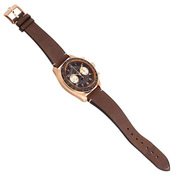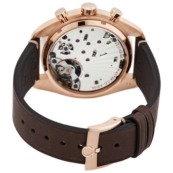 Rose gold-tone bronze case with a brown leather strap. Fixed tachymeter scale black bronze bezel. Brown dial with rose gold-tone hands and Arabic numeral hour markers. Minute markers around the outer rim. Dial Type: Analog. Omega Calibre 9908 hand wind movement. Scratch resistant sapphire crystal. Transparent see through case back. Round case shape, case size: 43 mm. Buckle clasp. Water resistant at 50 meters / 165 feet. Functions: chronograph, hour, minute, second. Additional Info: original box, international warranty card, manual (complete accessories). Speedmaster Series. Luxury watch style. Watch label: Swiss Made. Omega Speedmaster Chronograph Hand Wind Brown Dial Men's Watch 329.92.43.51.10.001.