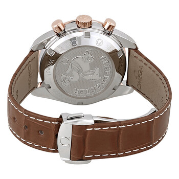 Silver-tone stainless steel case with a brown alligator leather strap. Fixed tachymeter scale 18kt rose gold bezel with a brown aluminum top ring. Rose dial with rose gold-tone hands and index hour markers. Minute markers around the outer rim. Dial Type: Analog. Luminescent hands and markers. Date display at the 6 o'clock position. Chronograph - three sub-dials displaying: 60 second, 30 minute and 12 hour. Omega Calibre 3330 Automatic movement, based upon ETA Valjoux 7753, containing 31 Jewels, bitting at 28800 vph, and has a power reserve of approximately 52 hours. Scratch resistant sapphire crystal. Pull / push crown. Solid case back. Round case shape, case size: 38 mm. Band width: 18 mm. Deployment with push button release clasp. Water resistant at 100 meters / 330 feet. Functions: chronograph, date, hour, minute, second. Speedmaster Series. Casual watch style. Watch label: Swiss Made. Omega Speedmaster Co-Axial Chronograph Automatic 38mm Watch 324.23.38.50.02.002.