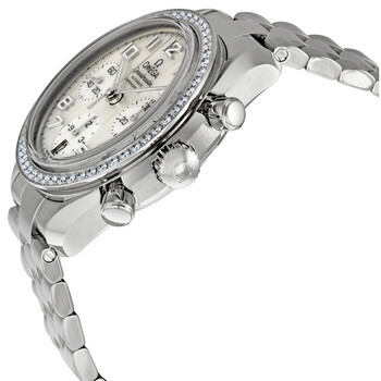 Silver-tone stainless steel case with a silver-tone stainless steel bracelet. Fixed silver-tone bezel with diamond set. Mother of pearl dial with luminous silver-tone hands and Arabic numeral hour markers. Minute markers around the outer rim. Dial Type: Analog. Luminescent hands and markers. Date display at the 6 o'clock position. Chronograph - three sub-dials displaying: 60 second, 30 minute and 12 hour. Omega Calibre 3304 Automatic movement, based upon ETA 7753, containing 27 Jewels, bitting at 28800 vph, and has a power reserve of approximately 48 hours. Scratch resistant sapphire crystal. Pull / push crown. Solid case back. Round case shape, case size: 38 mm, case thickness: 14.7 mm. Band width: 18 mm. Deployment clasp. Water resistant at 100 meters / 330 feet. Functions: chronograph, date, hour, minute, second, chronometer. Speedmaster Series. Sport watch style. Watch label: Swiss Made. Item Variations: 324 15 38 40 05 001, 324-15-38-40-05-001, 324/15/38/40/05/001, 32415384005001. Omega Speedmaster Diamond Bezel Automatic Chronograph Ladies Watch 324.15.38.40.05.001.