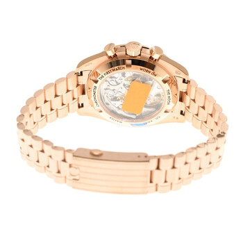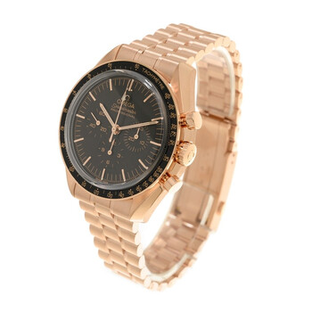 18kt rose gold case and bracelet. Fixed black bezel. Black dial with rose gold-tone hands and index hour markers. Minute markers around the outer rim. Dial Type: Analog. Luminescent hands and markers. Chronograph - three sub-dials displaying: 60 second, 30 minute and12 hour. Omega Calibre 3861 Automatic movement, based upon Lemania 1873, containing 26 Jewels, bitting at 21600 vph, and has a power reserve of approximately 50 hours. Scratch resistant sapphire crystal. Pull / Push crown. Transparent see through case back. Round case shape, case size: 42 mm. Deployment clasp. Water resistant at 50 meters / 165 feet. Functions: chronograph, hour, minute, second. Speedmaster Series. Sport watch style. Watch label: Swiss Made. Omega Speedmaster Moonwatch Chronograph Automatic Black Dial Men's Watch 310.60.42.50.01.001.