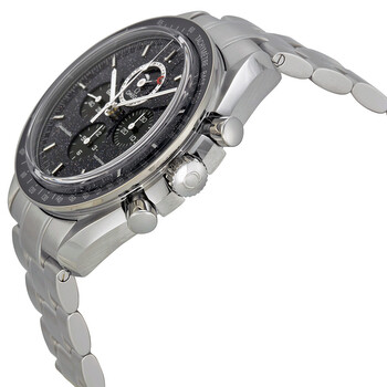 Stainless steel case with a stainless steel bracelet. Fixed stainless steel bezel with a black top ring showing tachymeter markings. Black (star field) dial with luminous silver-tone hands and index hour markers. Minute markers around the outer rim. Dial Type: Analog. Luminescent hands and markers. Chronograph - three sub-dials displaying: 60 second, 30 minute and 12 hour. Date sub-dial at the 12 o'clock position. Hand Wind movement with a 48-hour power reserve. Scratch resistant sapphire crystal. Pull / push crown. Skeleton case back. Case diameter: 44.25 mm. Round case shape. Band length: 6 inches. Fold over deployment clasp. Water resistant at 100 meters / 330 feet. Functions: chronograph, date, hour, minute, second. Dress watch style. Omega Speedmaster Moonwatch Chronograph Black Dial Stainless Steel Men's Watch 31130443201001.