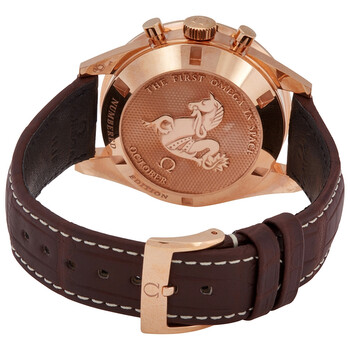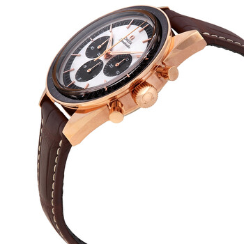 18k sedna gold case with a brown alligator leather strap. Fixed bezel. Silver dial with rose gold-tone hands and index hour markers. Minute markers around the outer rim. Dial Type: Analog. Chronograph - three sub-dials displaying: 60 second, 30 minute and 12 hour. Hand wind movement. Omega 1861 engine. Scratch resistant sapphire crystal. Case diameter: 39.7 mm. Round case shape. Deployment clasp. Water resistant at 50 meters / 165 feet. Functions: chronograph, hour, minute, second. Luxury watch style. Watch label: Swiss Made. Omega Speedmaster Moonwatch Numbered Edition 18K Sedna Gold Men's Watch 311.63.40.30.02.001.