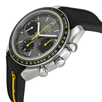 Stainless steel case with a black rubber strap. Fixed stainless steel bezel with an inlaid black aluminum ring showing tachymeter markings. Grey dial with luminous silver-tone hands and index hour markers. Minute markers around the outer rim. Dial Type: Analog. Luminescent hands and markers. Date display at the 6 o'clock position. Chronograph - three sub-dials displaying: 60 second, 30 minute and 24 hour. Omega calibre 3330 automatic movement with a 52-hour power reserve. Domed anti-reflective scratch resistant sapphire crystal. Pull / push crown. Solid case back. Round case shape. Case size: 40 mm. Band width: 19 mm. Tang clasp. Water resistant at 100 meters / 330 feet. Functions: chronograph, tachymeter, date, hour, minute, second, chronometer. Additional Info: having been a part of all six lunar missions, the omega speedmaster is one of its most iconic timepieces. Sport watch style. Watch label: Swiss Made. Omega Speedmaster Racing Automatic Chronograph Men's Watch 32632405006001.