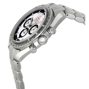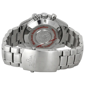 Stainless steel case with a stainless steel link bracelet. Fixed with tachymeter bezel. Ivory dial with luminous hands and index hour markers. Minute markers around the outer rim. Date displays at the 6 o'clock position. There: 1/10th second, 30 minutes, 60 seconds sub dials. Automatic movement. Scratch resistant sapphire crystal. Case diameter: 42 mm. Case thickness: 14.3 mm. Push button deployment clasp. Water resistant at 100 meters / 330 feet. Functions: hours, minutes, seconds, date, chronograph, tachymeter. Omega Speedmaster Schumacher Legend Men's Watch 3506.31.