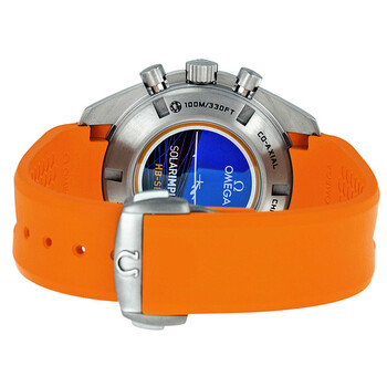 Titanium case with a orange rubber strap. Fixed titanium bezel with a black PVD top ring showing tachymeter markings. Black carbon fibre dial with luminous silver-tone hands and index hour markers. Minute markers and 24 hour (GMT) around the outer rim. Dial Type: Analog. Luminescent hands and markers. Date display between the 4 and 5 o'clock positions. Chronograph - three sub-dials displaying: 60 second, 30 minute and 12 hour. Omega calibre 3603 automatic movement with a 52-hour power reserve. Scratch resistant sapphire crystal. Screw down crown. Solid case back. Case size: 44 mm. Case thickness: 14 mm. Round case shape. Band width: 21 mm. Deployment clasp with a push button release. Water resistant at 100 meters / 330 feet. Functions: chronograph, GMT, second time zone, date, hour, minute, second, chronometer, tachymeter. Additional Info: suitable for snorkeling, as well as swimming, but not diving. Casual watch style. Watch label: Swiss Made. Item Variations: 321 92 44 52 01 003, 321-92-44-52-01-003, 321/92/44/52/01/003, 32192445201003. Omega Speedmaster Solar Impulse Chronograph GMT Men's Watch 321.92.44.52.01.003.