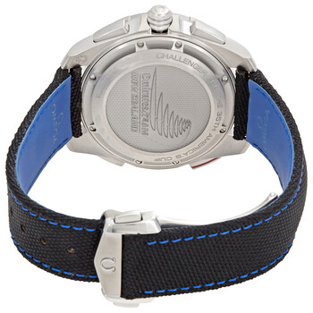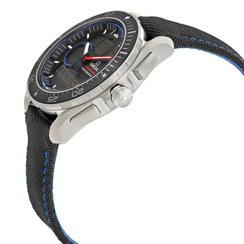Grey titanium case with a black nylon fabric strap. Bi-directional rotating grey titanium bezel with a black ceramic top ring. Black Analog-digital dial with luminous red and blue hands and index hour markers. Minute markers around the outer rim. Dial Type: Analog-digital. Luminescent hands and markers. Perpetual calendar. Omega calibre 5620 quartz movement. Scratch resistant sapphire crystal. Solid case back. Round case shape. Case size: 45 mm. Band width: 20 mm. Deployment clasp. Water resistant at 30 meters / 100 feet. Functions: hour, minute, second, two alarms, chronograph, EOL feature, perpetual calendar, racing countdown, 3 time zones. Additional Info: limited edition. Sport watch style. Watch label: Swiss Made. Omega Speedmaster X-33 Regatta Mnes Limited Edition Watch 318.92.45.79.01.001.